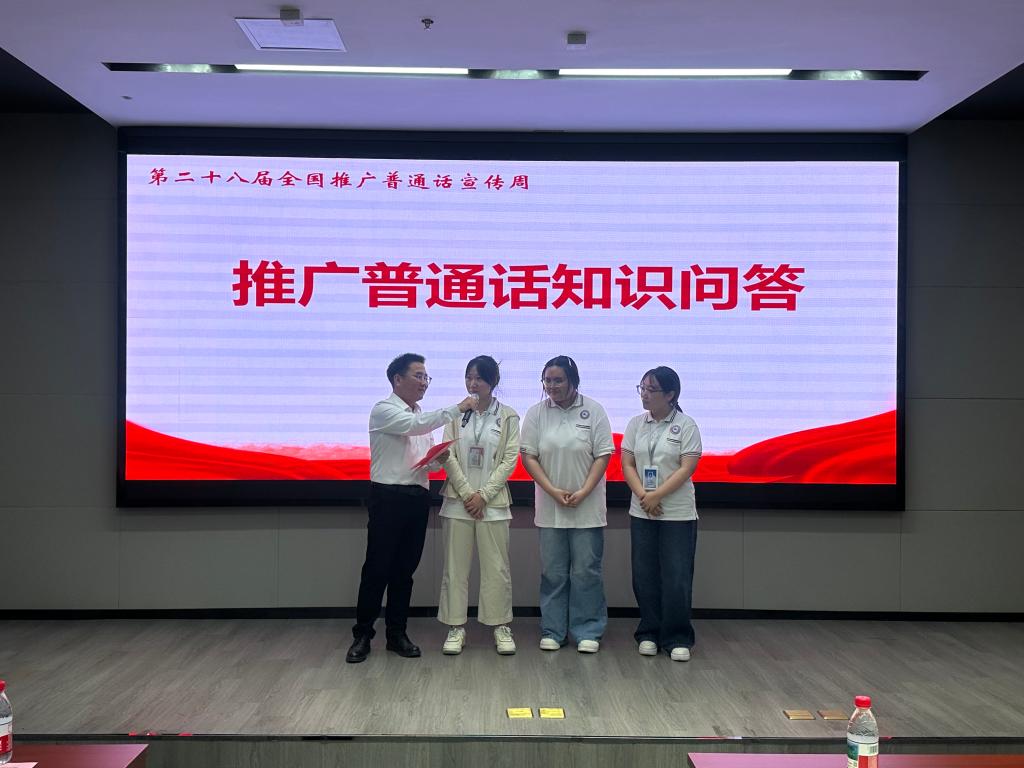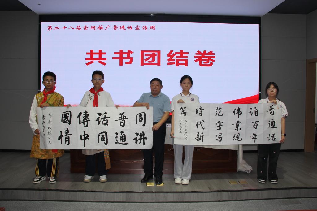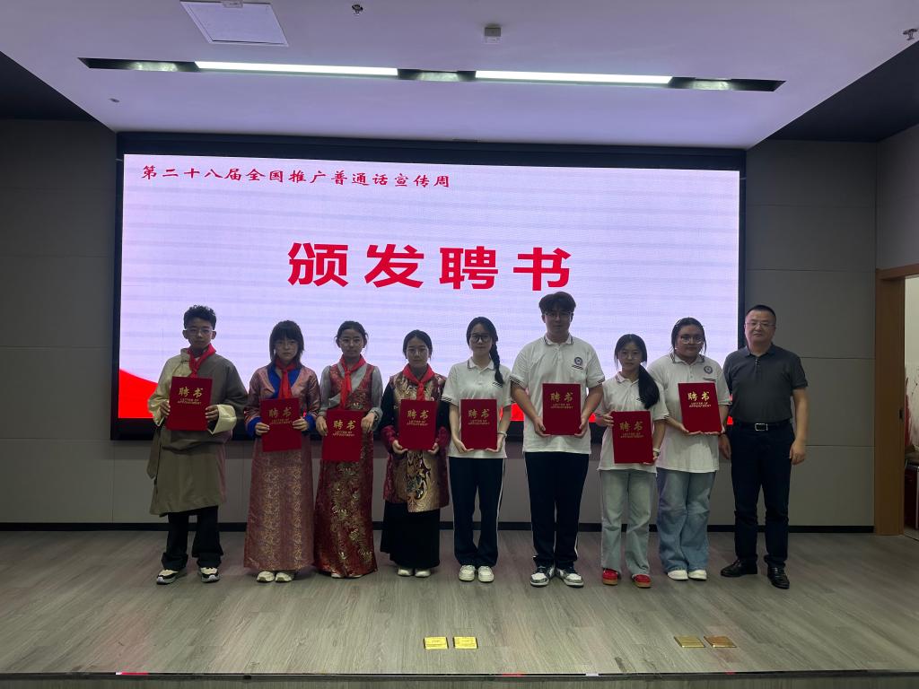 为进一步推动国家通用语言文字普及工作,活动现场聘任了一批“国家通用语言文字推广使者”。我校2181班李孙祎、文迅、葛诗语以及2283班钱浩天四位同学获此殊荣,体现了我校在提升学生语言文化素养、强化社会责任意识方面取得的扎实成效。