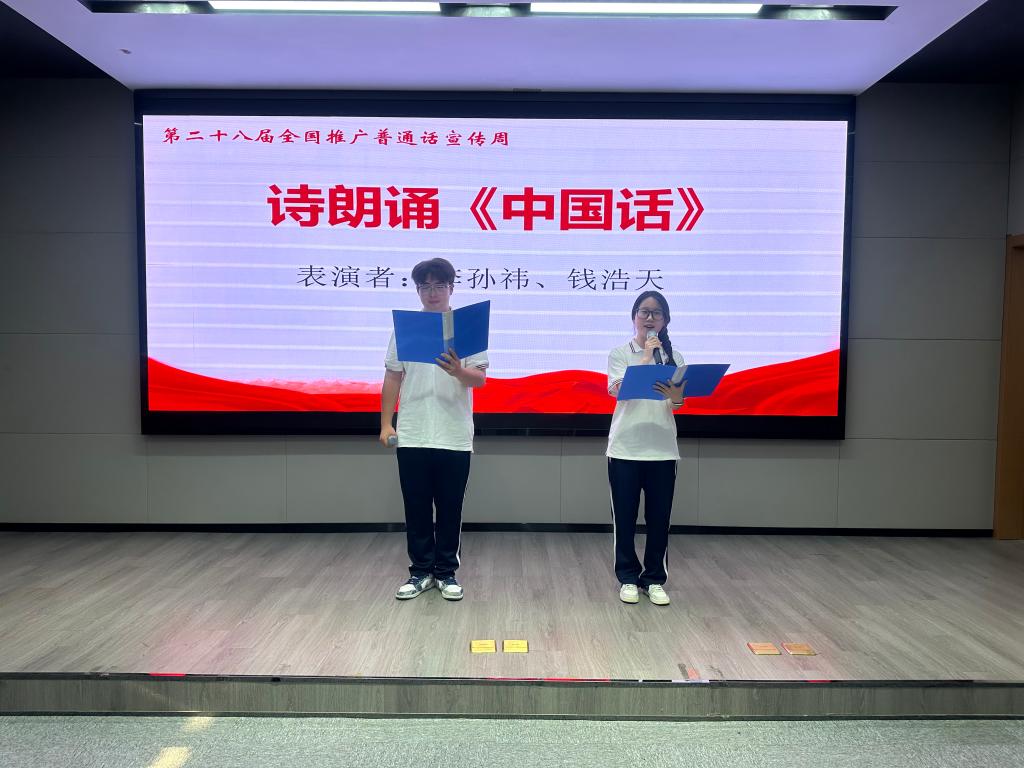 活动中,我校2181班李孙祎、2283班钱浩天同学共同表演诗朗诵《中国话》,以标准流畅的发音、真挚动人的演绎,生动展现了国家通用语言文字的韵律之美和深厚文化内涵,获得现场观众一致好评。2182班宋钱熙同学通过歌曲演唱,表达了对梦想的坚定追求和对祖国的深切热爱,赢得阵阵掌声。
