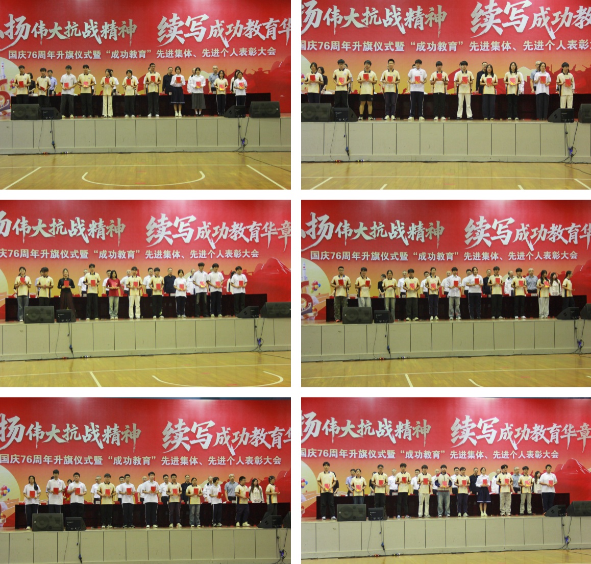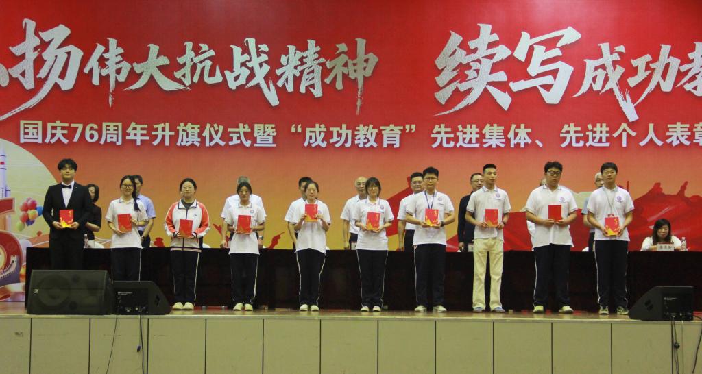 9月30日上午,我校在学校体育馆举行以“弘扬伟大抗战精神,续写成功教育华章”为主题的国庆76周年升旗仪式暨第十四届“成功教育”先进集体、先进个人表彰大会。校领导班子成员、校关工委领导、家长代表及全校师生参加这一盛大活动。